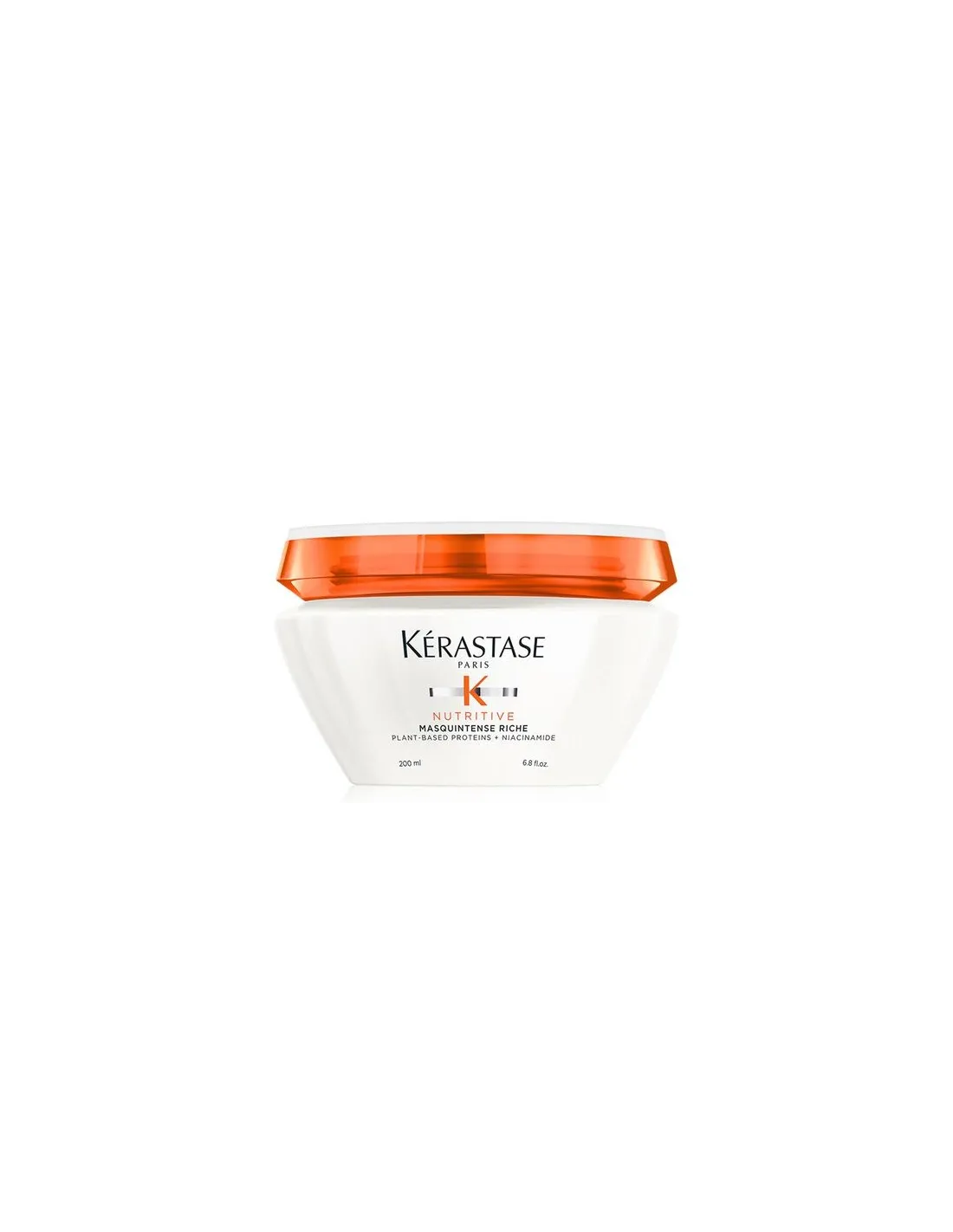Le Masquintense de Kérastase est un masque nourrissant, idéal pour les cheveux très secs. Sa formule crème satinée légère renforce et nourrit les cheveux très secs fins à moyens. Enrichi en protéines d'origine végétale et en Niacinamide, un actif issu des soins de la peau qui renforce le cheveu, ce masque restaure la barrière protectrice naturelle du cheveu en ciblant les zones en manque de nutrition.